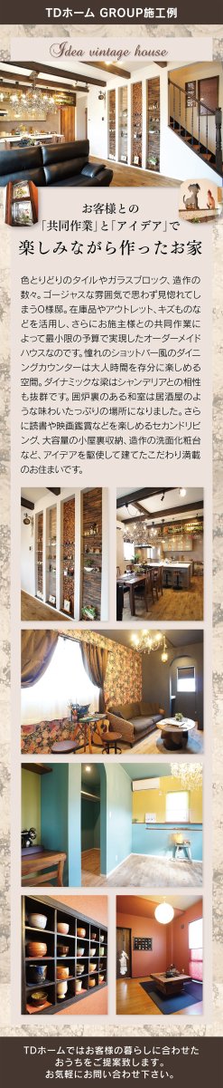 在庫品やアウトレット素材を活用しコストを抑えた注文住宅。タイルやガラスブロックの装飾に加え、バー風ダイニングや囲炉裏、セカンドリビングなどこだわり満載の住まいです。