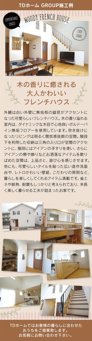 吹き抜けリビングと無垢材の温もりが魅力のフレンチハウス。家事動線に優れ、造作収納や可愛いキッチンなど暮らしやすさとデザイン性を両立した住まいです。