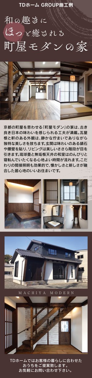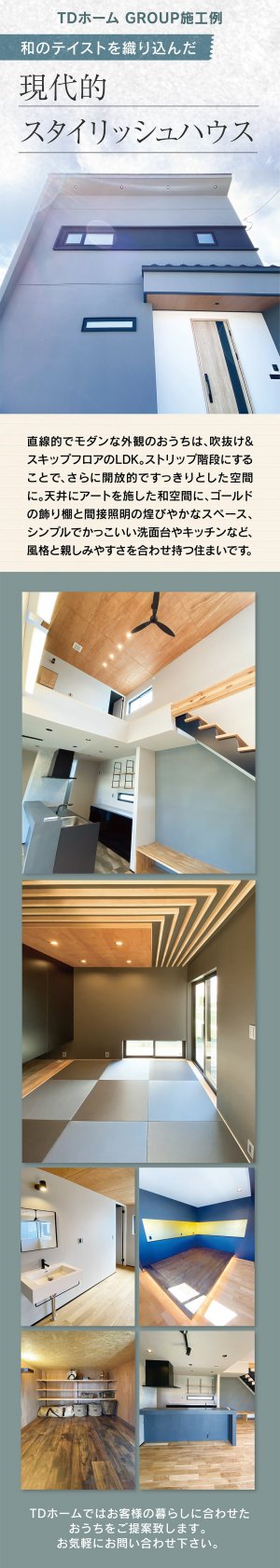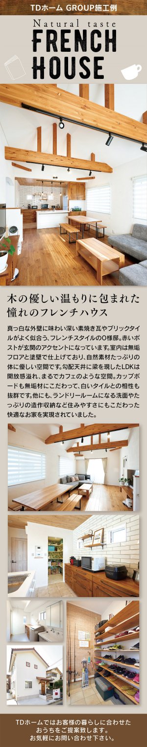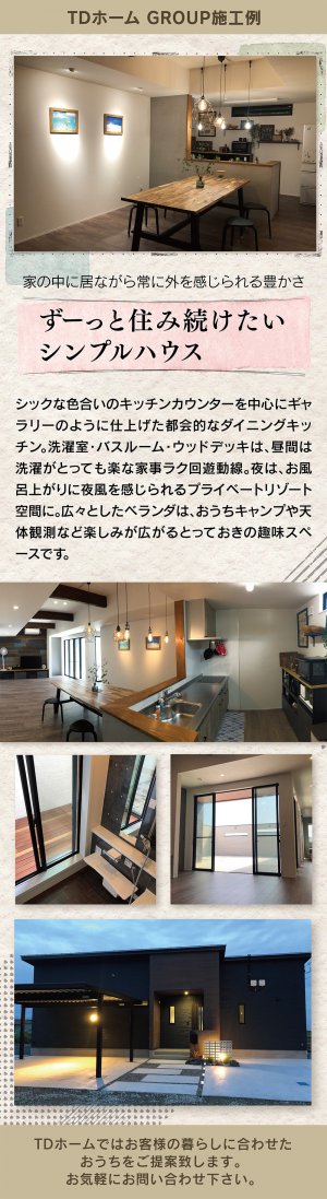 富山県富山市のTDホーム富山では、新築(注文住宅)、リノベーションで、お客様の暮らしに合わせたおうちをご提案致します。高性能・省エネハウスはもちろん、長期優良住宅にも、私たちTDホームは対応しております。和モダンスタイル・モダンスタイル・カリフォルニアスタイル(サーファーズスタイル)などの新築からリフォームまで、住まいの事ならお気軽にご相談下さい。