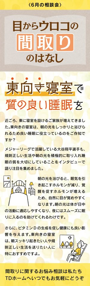 東向きの寝室は朝日を浴びやすく、体内リズムを整える効果があり快眠に役立ちます。近年、東に寝室を設ける家庭が増えています。