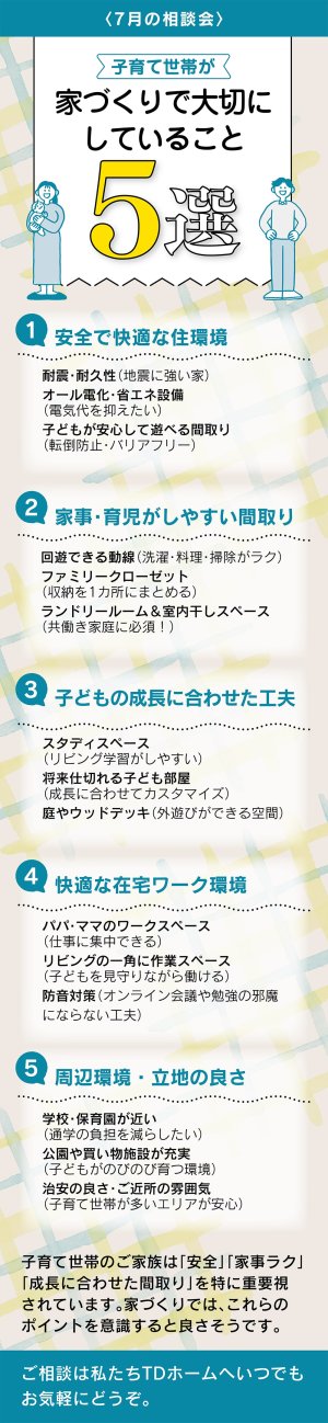 子育て世帯の家づくりで大切な5つのポイントは、安全で快適な住環境、家事・育児がしやすい間取り、成長に合わせた工夫、在宅ワークの快適さ、立地の良さ。これらを意識することで、後悔のない住まいを実現できます!
