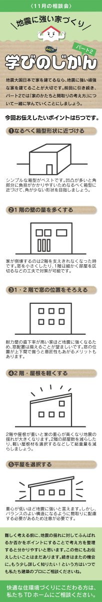 地震に強い家づくりのポイント第2弾。家の形状や間取りの工夫で、より安全で快適な住まいを実現する方法を解説します。