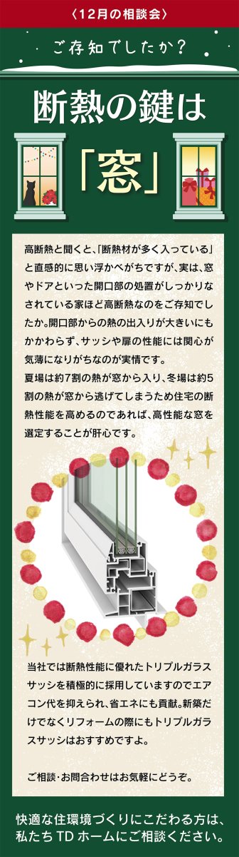 高断熱住宅には断熱材だけでなく、窓やドアなど開口部の性能が重要です。夏は約7割の熱が入り、冬は約5割が逃げるため、高性能なトリプルガラスサッシの採用が省エネと快適性に大きく貢献します。